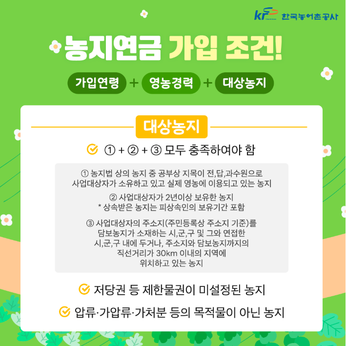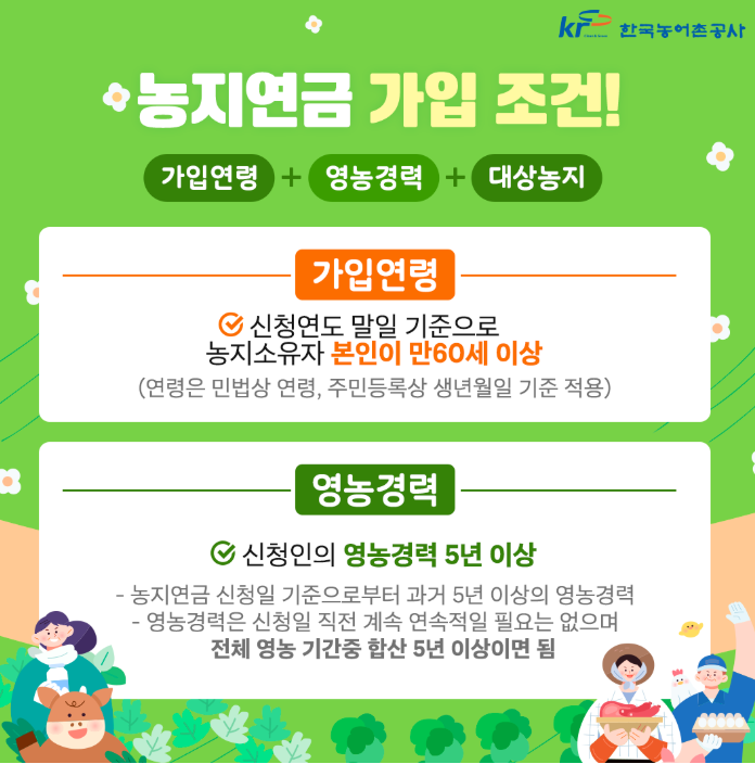 가입조건은 다소 까다롭지만, 요건을 충족한다면 농지를 유지하면서 안정적인 월 소득을 확보할 수 있는 현실적인 선택지였습니다.