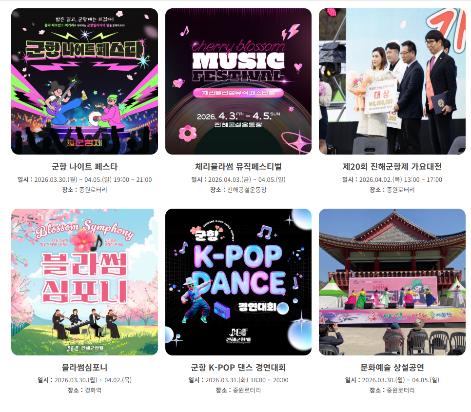👉 이 기간 동안 진해는 도시 전체가 벚꽃으로 물들며, 다양한 공연과 체험 행사가 동시에 진행됩니다.