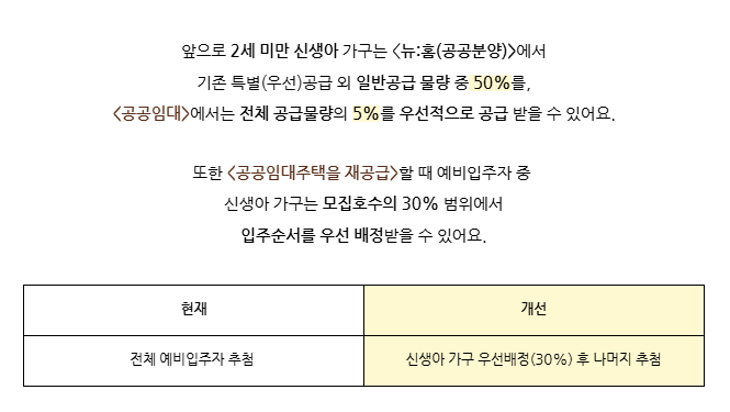 이에 따라 정부는 출산을 장려하고 신생아 가구의 주거 안정을 지원하기 위해 2세 미만 신생아 가구를 대상으로 한 특별청약 제도를 도입하게 되었습니다. 이 제도는 신생아를 둔 가구에 주택 청약 시 우선권을 부여함으로써, 출산 가구의 주거 안정을 도모하고자 합니다.