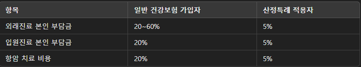 일반적으로 건강보험 가입자는 외래·입원 진료 시 본인 부담금이 발생하지만, 암환자는 산정특례 적용을 받으면 본인 부담금이 5%로 줄어듭니다.
