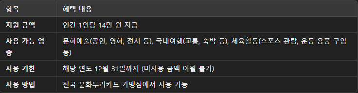 문화누리카드는 경제적 어려움을 겪는 분들에게 다양한 문화·여가 생활을 누릴 기회를 제공합니다. 연간 14만 원이라는 혜택을 꼭 활용하여 영화, 공연, 여행 등 다양한 경험을 즐기시길 바랍니다.