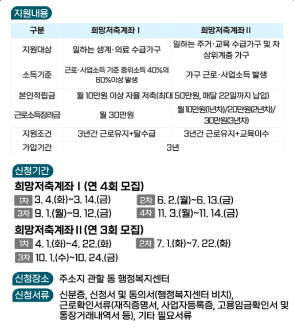 희망저축계좌 1·2는 저소득층이 자립할 수 있도록 도와주는 중요한 지원 제도입니다. 특히 생계급여 또는 차상위 계층에 해당하는 분들은 놓치지 말고 신청해야 합니다.