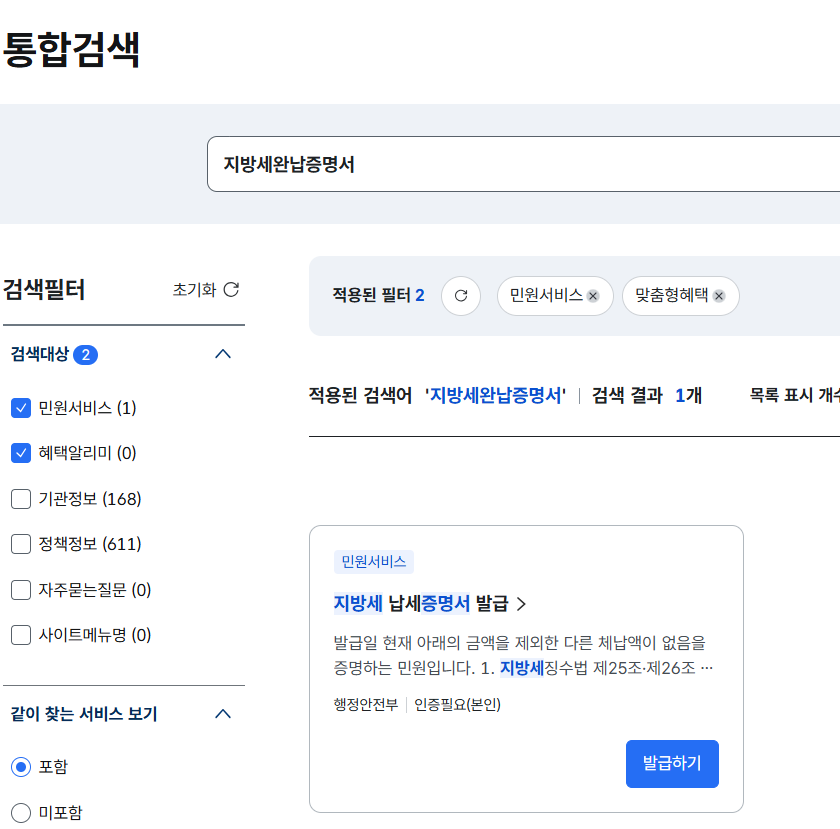 - 검색창에 ‘지방세완납증명서’ 입력